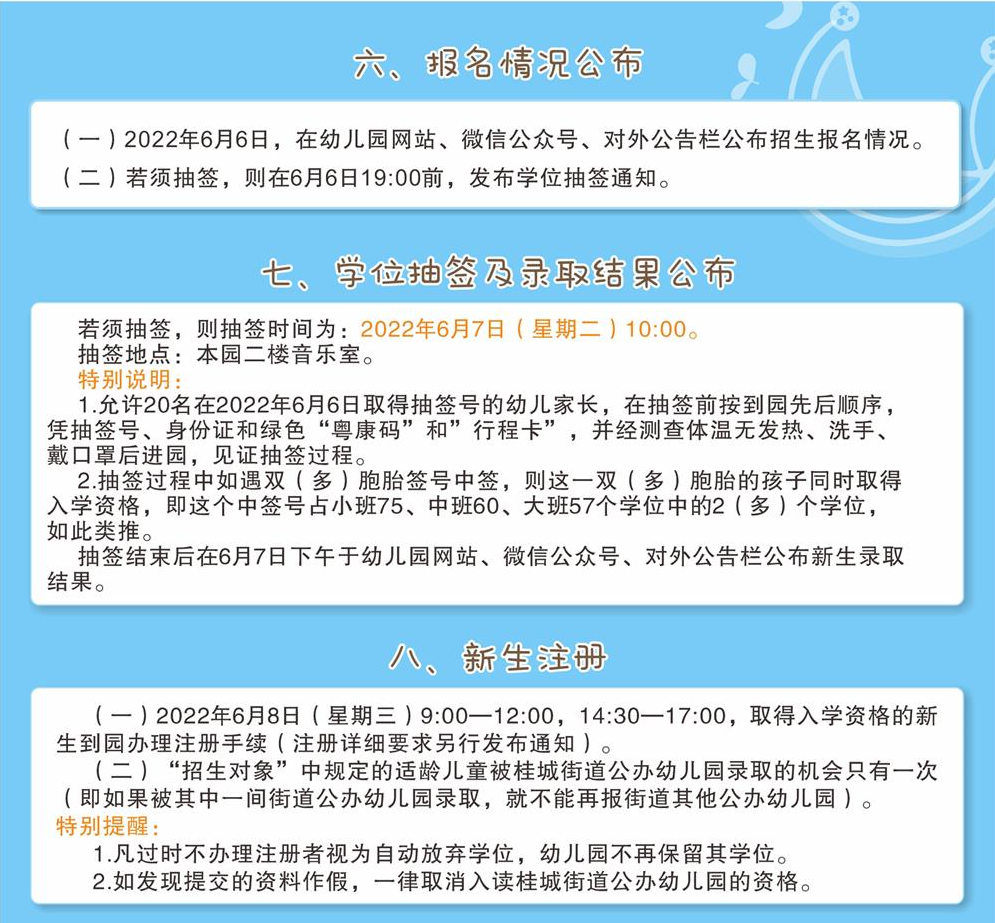 2022年6月6日(星期一)9:00—12:00、14:30—16:00接受家长到幼儿园提交报名资料,并向符合条件的报名者发放抽签号【双(多)胞胎只领取一个号码】。