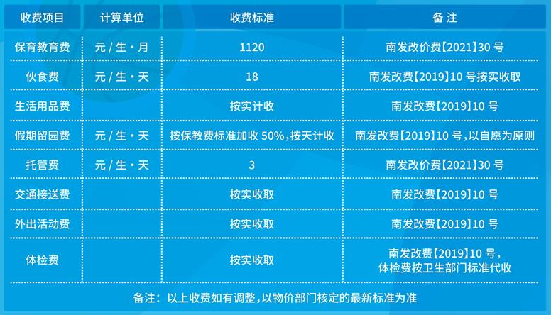 目前收费标准按照南发改价费【2021】30号、南发改费【2019】10号文件执行。鉴于幼儿园于2022年9月1日开学,开学前收费标准如有调整则按南海区发展和改革局最新核定的标准执行。代收代支费按实收取。