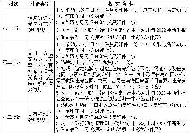 第一批次:具有户籍登记地址为桂城街道龙光紫尚苑的适龄幼儿【以户口本为准,截止到2022年4月30日(含)】。