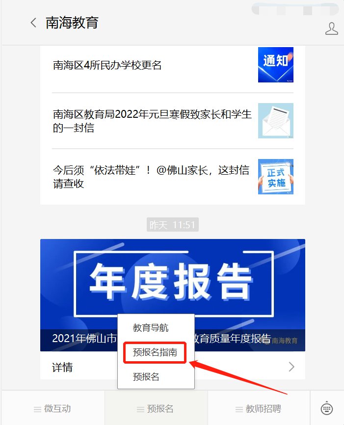 2、通过【南海教育】公众号下方菜单栏中的“预报名”入口进入系统。