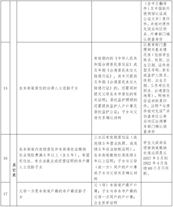 西南街道2022年政策性借读生申请入学证明材料一览表: