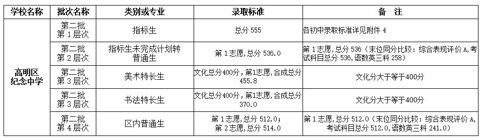 根据市、区2021年高中阶段学校招生录取有关规定,经研究,划定高明区2021年高中阶段学校招生第二批各层次最低录取控制分数线及录取标准,并予以公布。