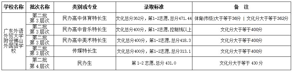 ▶广外佛山外校第二批各层次录取分数和标准: