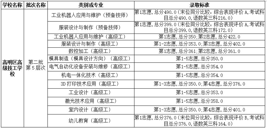 ▶高明区高级技工学校第二批录取分数和标准: