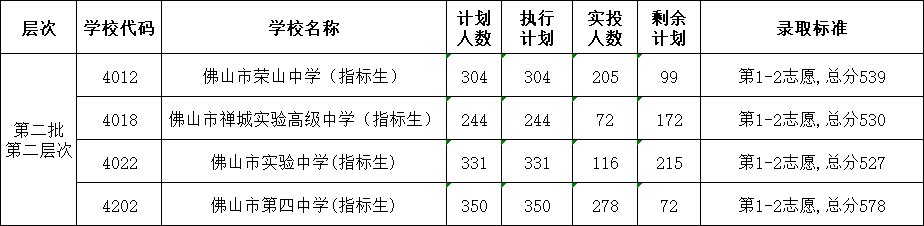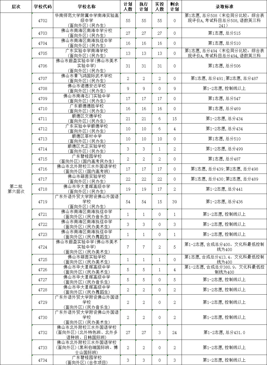 第二层次,佛山四中等4所学校指标生面向本区招生,各学校录取分数线控制在不低于该校第一批面向全市招生普通生最低录取分数线15分以内。未完成计划转入第三层次招生。