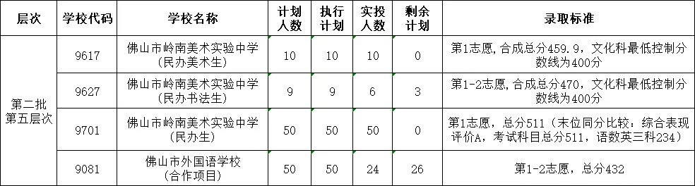 第五层次,佛山市岭南美术实验中学民办生、佛山市外国语学校合作项目面向本区招生,其最低录取控制分数线430分。