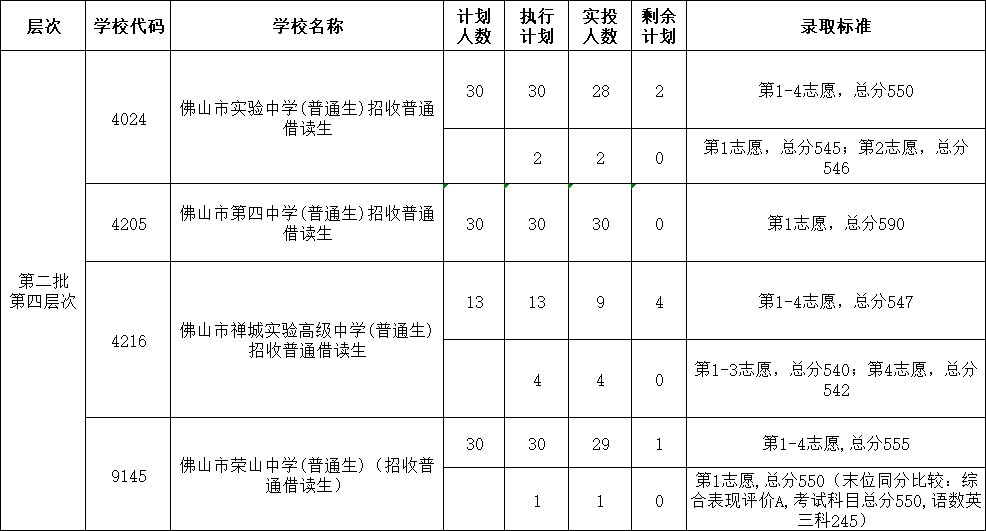 第四层次,佛山四中等4所学校普通生(不限制报考条件)面向本区招生,其最低录取控制分数线560分。在此分数线之上,部分学校的招生计划未完成,根据考生志愿的先后顺序从高分到低分录取的原则,以5分为一个分数段依次降分投档,直到该学校招生计划完成为止。