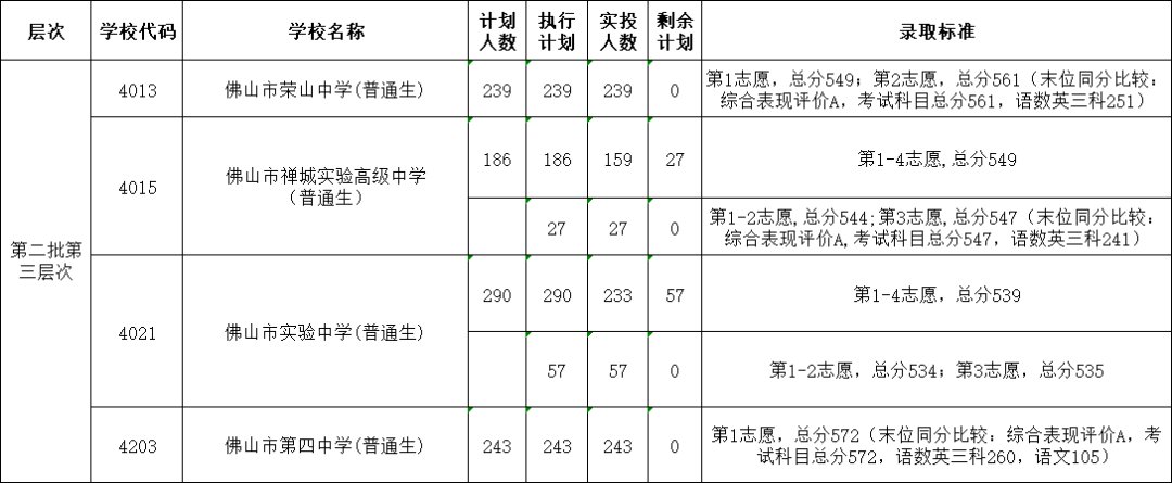 第三层次,佛山四中等4所学校普通生面向本区招生,其最低录取控制分数线549分。在此分数线之上,部分学校的招生计划未完成,根据考生志愿的先后顺序从高分到低分录取的原则,以5分为一个分数段依次降分投档,直到该学校招生计划完成为止。