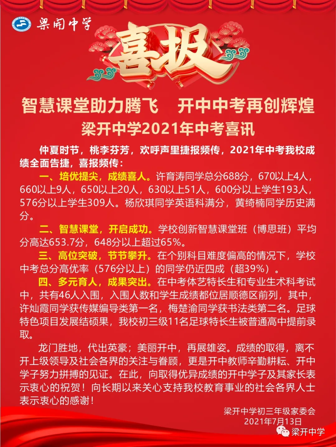 梁开中学2021年中考喜讯