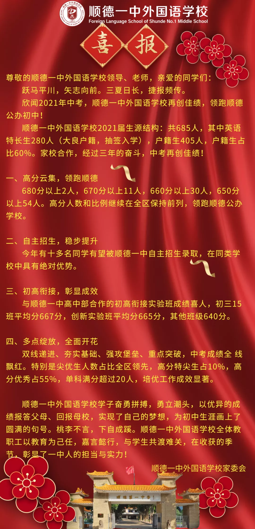 顺德一中外国语学校2021中考喜报 顺德一中外国语学校2021中考成绩