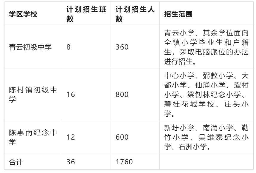 陈惠南纪念中学、陈村镇初级中学如有剩余学位,可接受学区变更申请。
