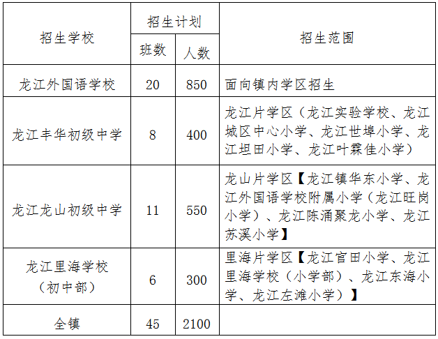 我镇公办初中招生实行全镇学区招生与对应学区分片招生相结合的原则。其中龙江外国语学校面向全镇学区招生,龙江丰华初级中学、龙江龙山初级中学、龙江里海学校(初中部)面向对应学区分片招生。