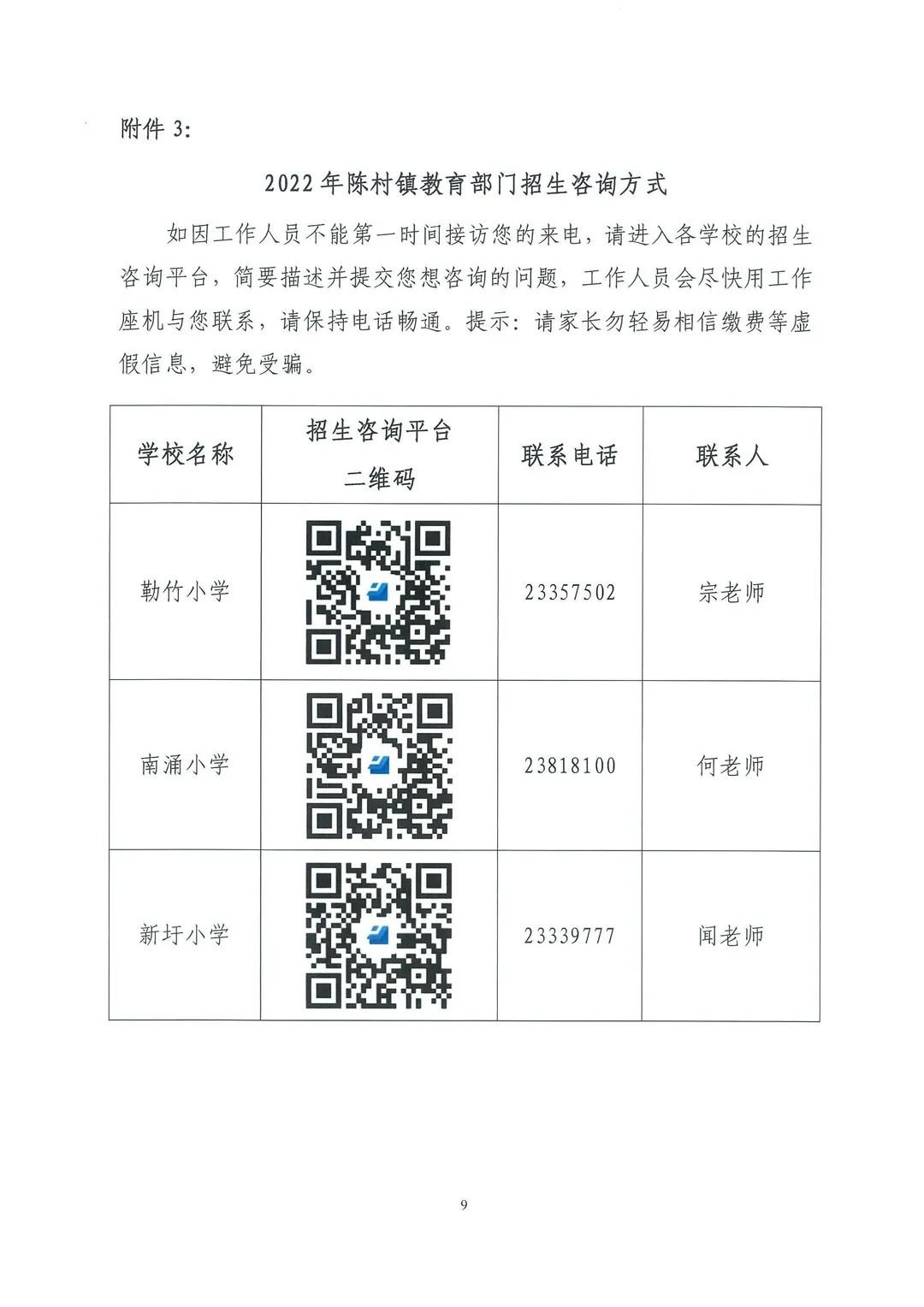 (八)本方案自公布之日起实施,并由陈村镇教育办公室负责解释。镇教育办招生咨询电话23830370,投诉电话23830091。