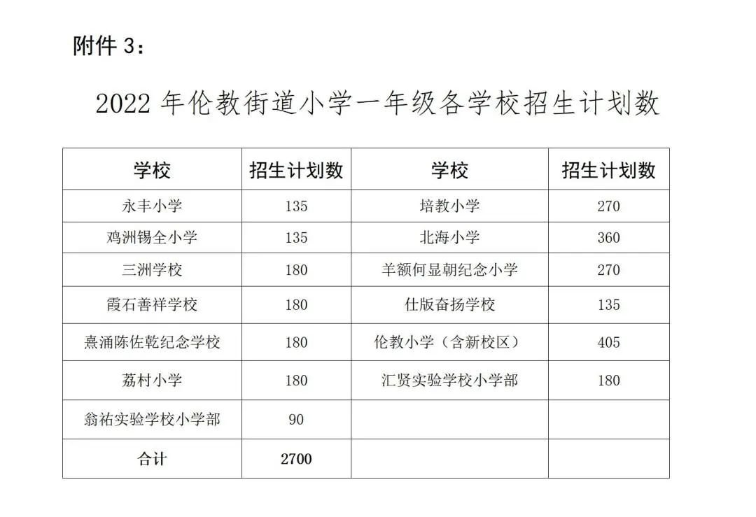 附件3:2022年伦教街道小学一年级各学校招生计划数