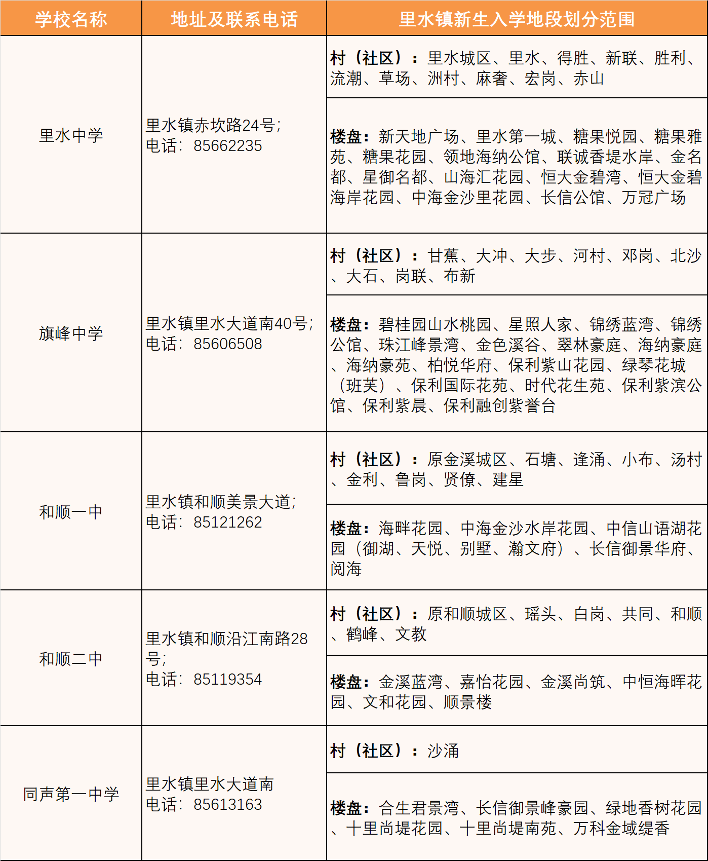 招生范围:里水镇公办初中本地户籍生、政策性借读生招生辖区划分表