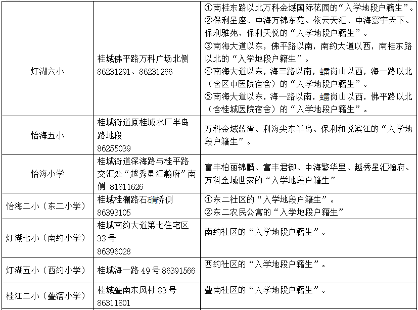 下表所指的“入学地段户籍生”是有时限性的,是指2022年4月8日前(含4月8日当天)入户在册的地段户籍生。之后迁入的该地段户籍生由桂城街道教育行政部门根据学位情况统筹安排到公办学校入读。