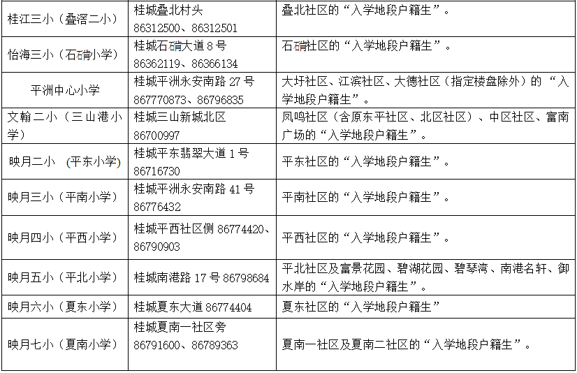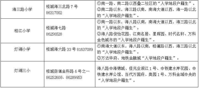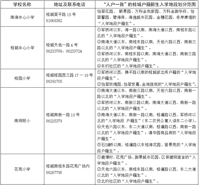 下表所指的“入学地段户籍生”是有时限性的,是指2022年4月8日前(含4月8日当天)入户在册的地段户籍生。之后迁入的该地段户籍生由桂城街道教育行政部门根据学位情况统筹安排到公办学校入读。