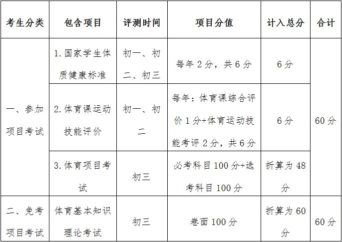 经区批准体育项目考试免考生,须参加全市统一组织的体育基本知识理论考试,理论考试成绩按满分60分折算计入中考总分(卷面分值乘以0.6,再四舍五入取整数)。