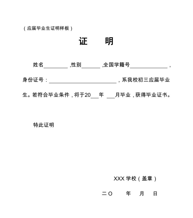 毕业学校出具的初三应届毕业证明(请按样式要求开具)或毕业证;