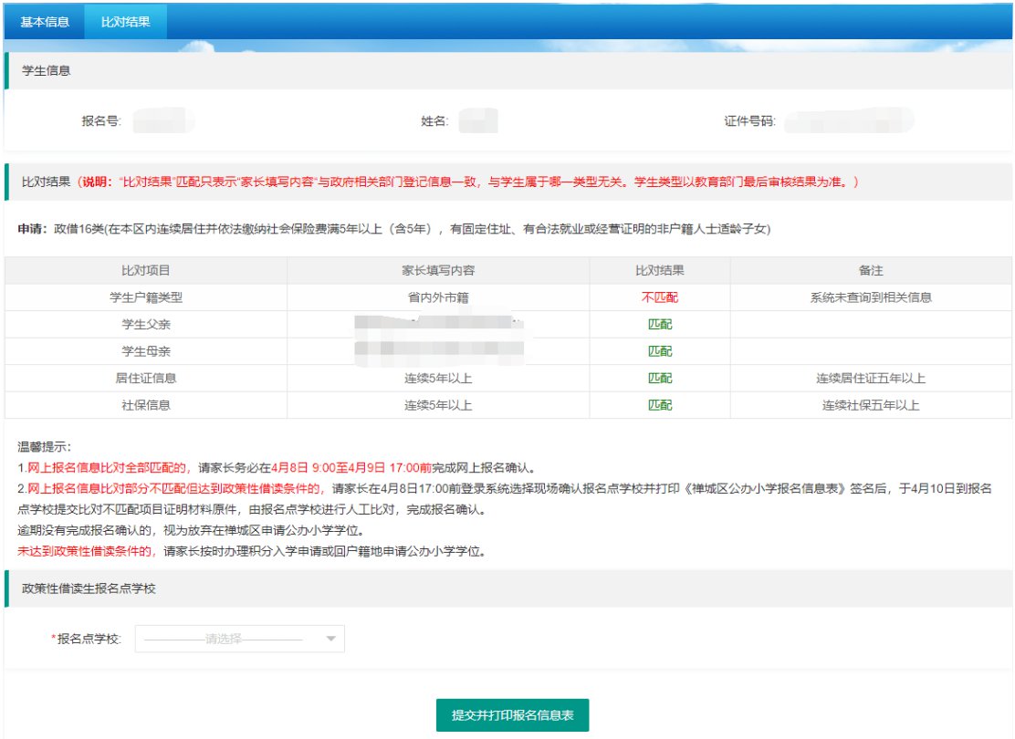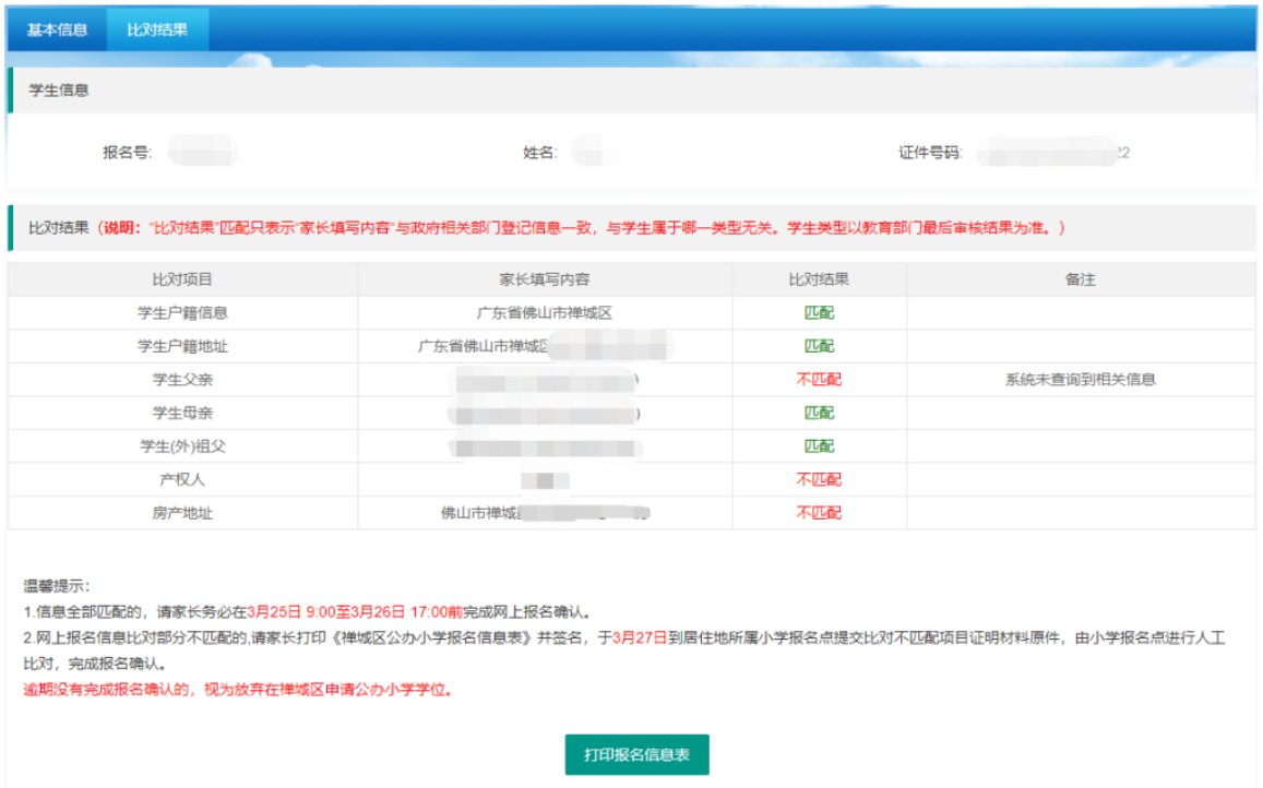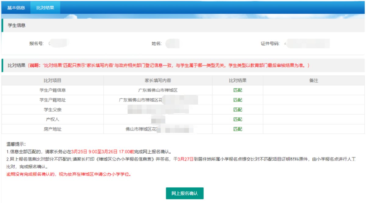 ②户籍生网上信息比对结果部分不匹配的,适龄儿童家长打印《禅城区公办小学报名信息表》签名后,于3月26日到居住地所属小学报名点提交比对不匹配项目证明材料原件,由小学报名点进行人工比对,完成报名确认。