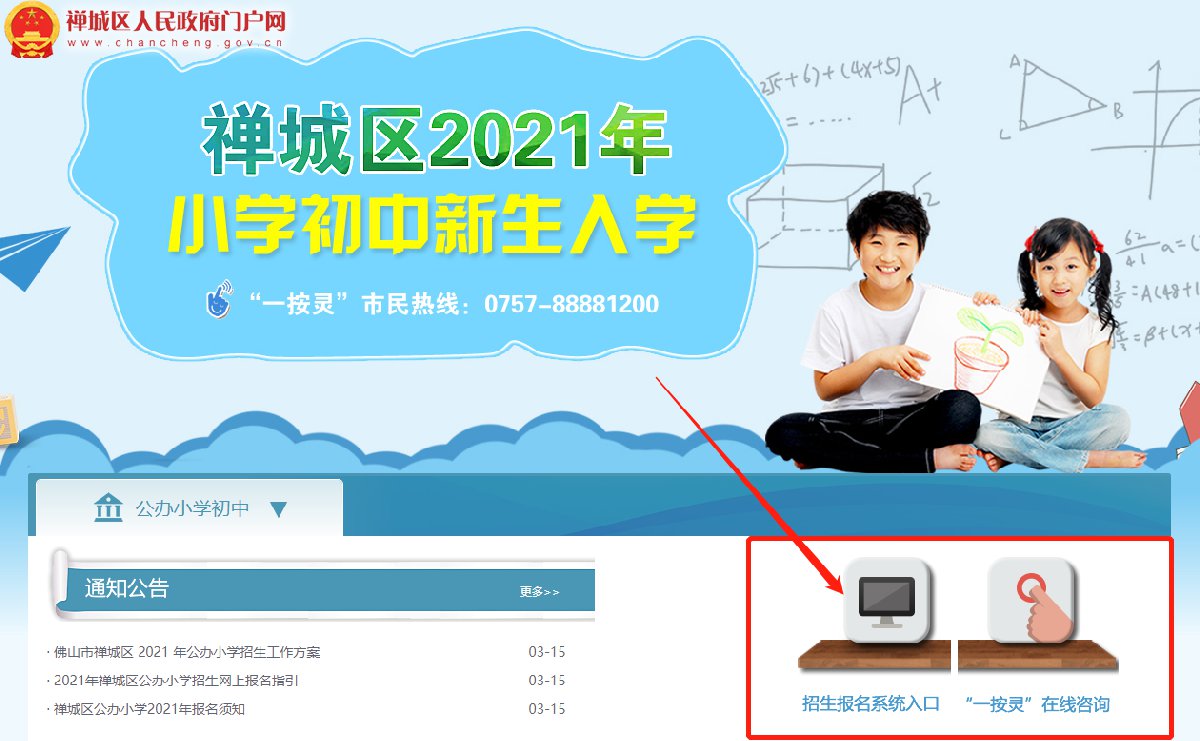 适龄儿童家长通过“禅城区人民政府门户网”→“禅城区2022年小学初中新生入学”专栏→登录“佛山市禅城区招生系统”进行网上报名。
