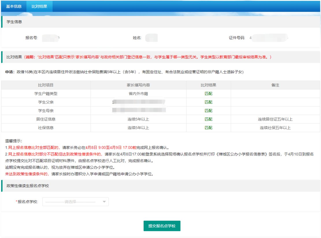 ②政策性借读生网上信息比对结果部分不匹配的但符合政策性借读条件的,适龄儿童家长4月7日17:00前登录招生系统选择现场确认报名点学校并打印《禅城区公办小学报名信息表》签名后,于4月9日到报名点学校提交比对不匹配项目证明材料原件,由报名点学校进行人工比对,完成报名确认。