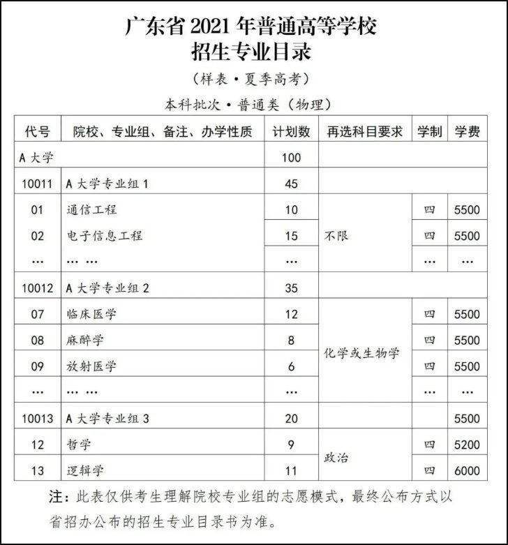 例:“A大学专业组1”选考科目要求为首选科目物理、再选科目不限,包括通信工程等若干专业;“A大学专业组2”选考科目要求为首选科目物理、再选科目化学或生物学,包括临床医学等若干专业。如考生首选科目为物理,再选科目为化学、生物学拟报考A大学通信工程和临床医学2个专业,则应填报 “A大学专业组1”和“A大学专业组2”两个院校专业组志愿,并分别在两个院校专业组中填报通信工程、临床医学专业志愿(《广东省2021年普通高等学校招生专业目录(样表·夏季高考)》见附件)。