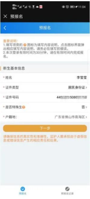 在“预报名”页面,输入新生的姓名,选择新生身份证类型,填写新生的身份证号码,选择是否特殊生,选择户籍地。