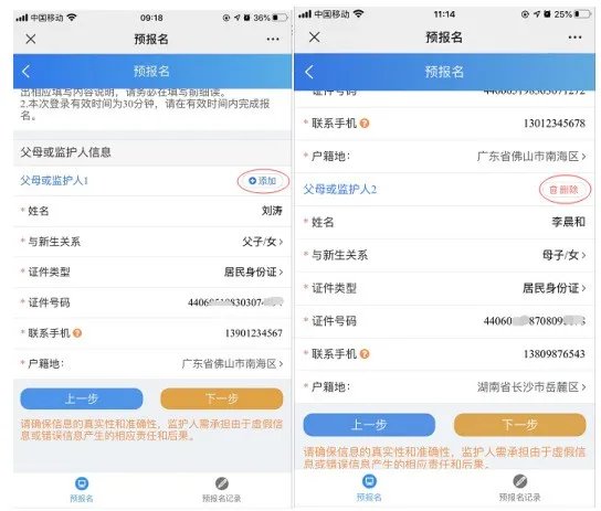 注:父母或监护人信息最多能填写两个。联系手机请填写归属地在广东省内的号码。