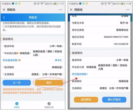 “报读意向”信息填完后,家长可以点击提交按钮,系统会显示“预报名信息浏览”的页面。