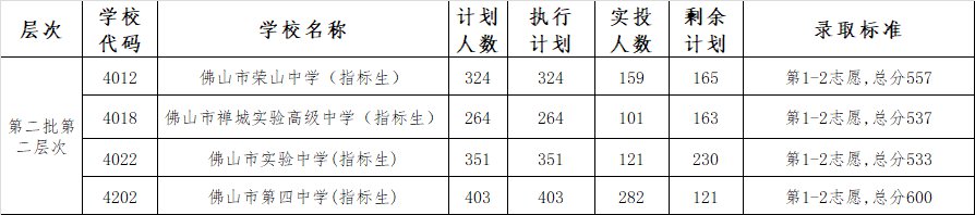 第二层次,佛山四中等4所学校指标生面向本区招生,各学校录取分数线控制在不低于该校第一批面向全市招生普通生最低录取分数线15分以内。未完成计划转入第三层次招生。