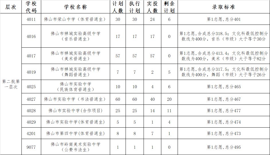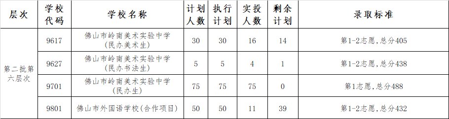 第六层次,佛山市岭南美术实验中学民办生及民办美术生、民办书法生、佛山市外国语学校合作项目面向本区招生,其最低录取控制分数线400分。