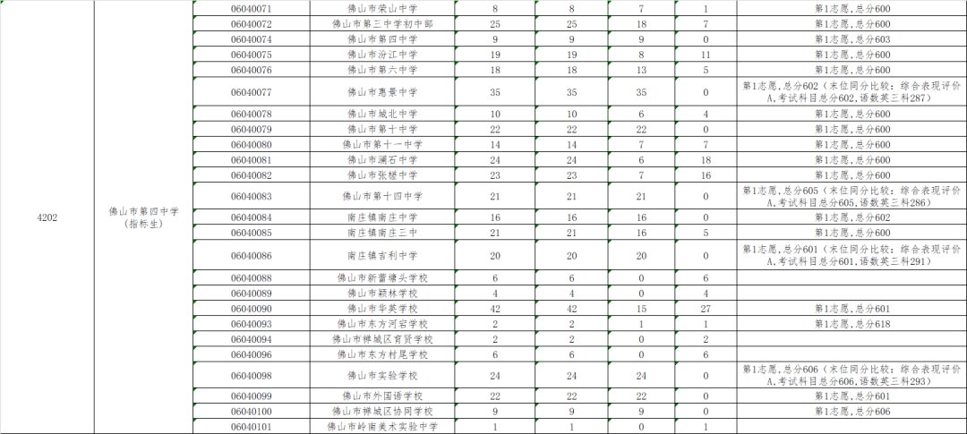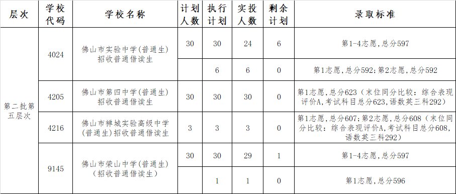 第五层次,佛山四中等4所学校普通生(不限制报考条件)面向本区招生,其最低录取控制分数线607分。在此分数线之上,部分学校的招生计划未完成,根据考生志愿的先后顺序从高分到低分录取的原则,以5分为一个分数段依次降分投档,直到该学校招生计划完成为止。