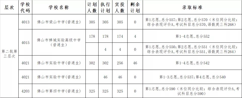 第三层次,佛山四中等4所学校普通生面向本区招生,其最低录取控制分数线557分。在此分数线之上,部分学校的招生计划未完成,根据考生志愿的先后顺序从高分到低分录取的原则,以5分为一个分数段依次降分投档,直到该学校招生计划完成为止。