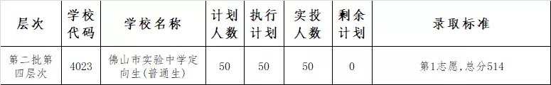 第四层次,佛山市实验中学定向生(普通生),其最低录取控制分数线487分。