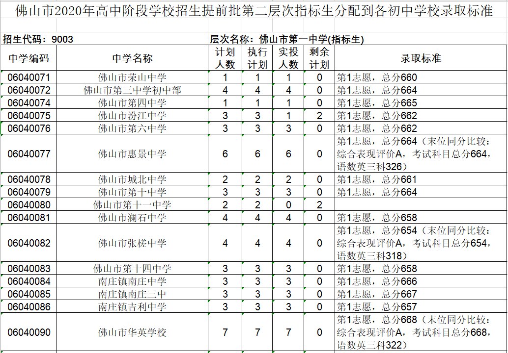 注:佛山一中等9所学校普通生、广东实验中学(创新人才)面向全市招生,其最低录取控制分数线658分。在此分数线之上,部分学校的招生计划未完成,市招生办根据考生志愿的先后顺序从高分到低分录取的原则,以5分为一个分数段依次降分投档,直到该学校招生计划完成为止。