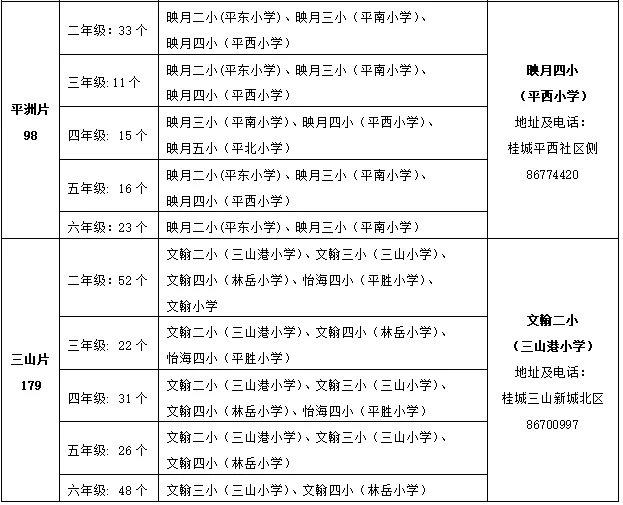 转学插班片区划分学位数及对应学校一览表: