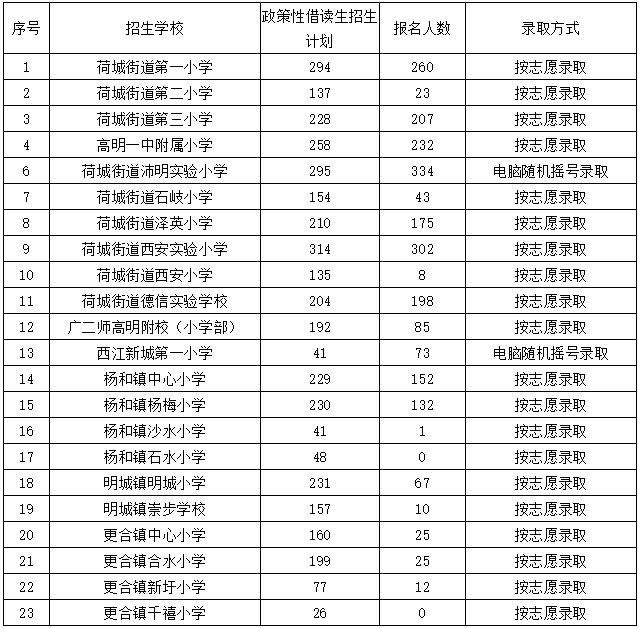 依据《佛山市高明区2020年义务教育阶段学校招生报名录取方案》的工作流程安排,2020年高明区公办小学政策性借读生招生报名情况及录取方式如下: