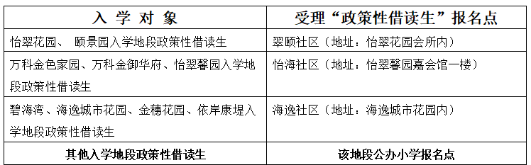 ●现场报名地点:受理“政策性借读生”报名的对应报名点,见下表: