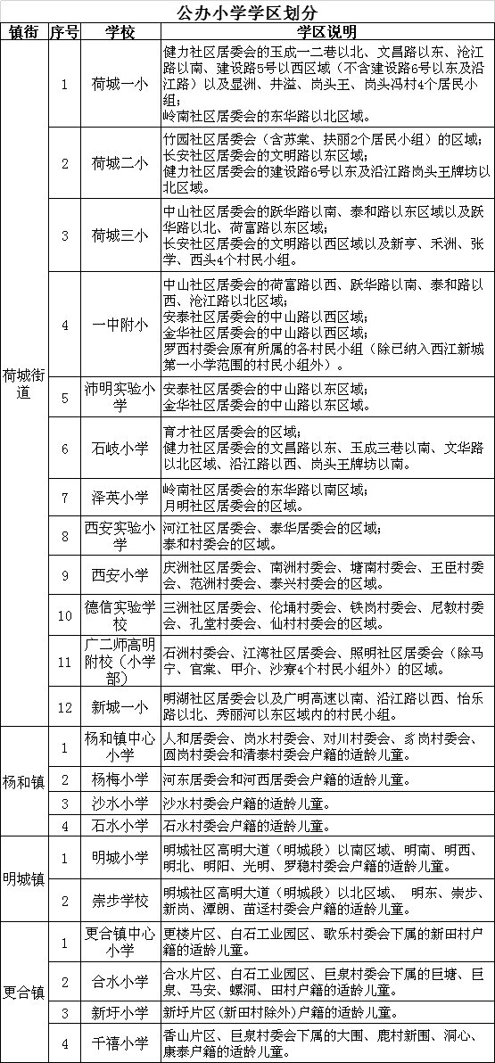 明城社区高明大道(明城段)以北区域、 明东、崇步、新岗、潭朗、苗迳村委会户籍的适龄儿童;