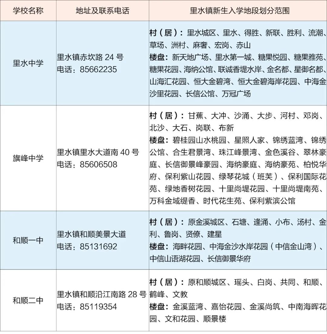 ①各学校的招生范围划分请详细阅读《2020年里水镇公办初中招生辖区划分一览表》中的内容。