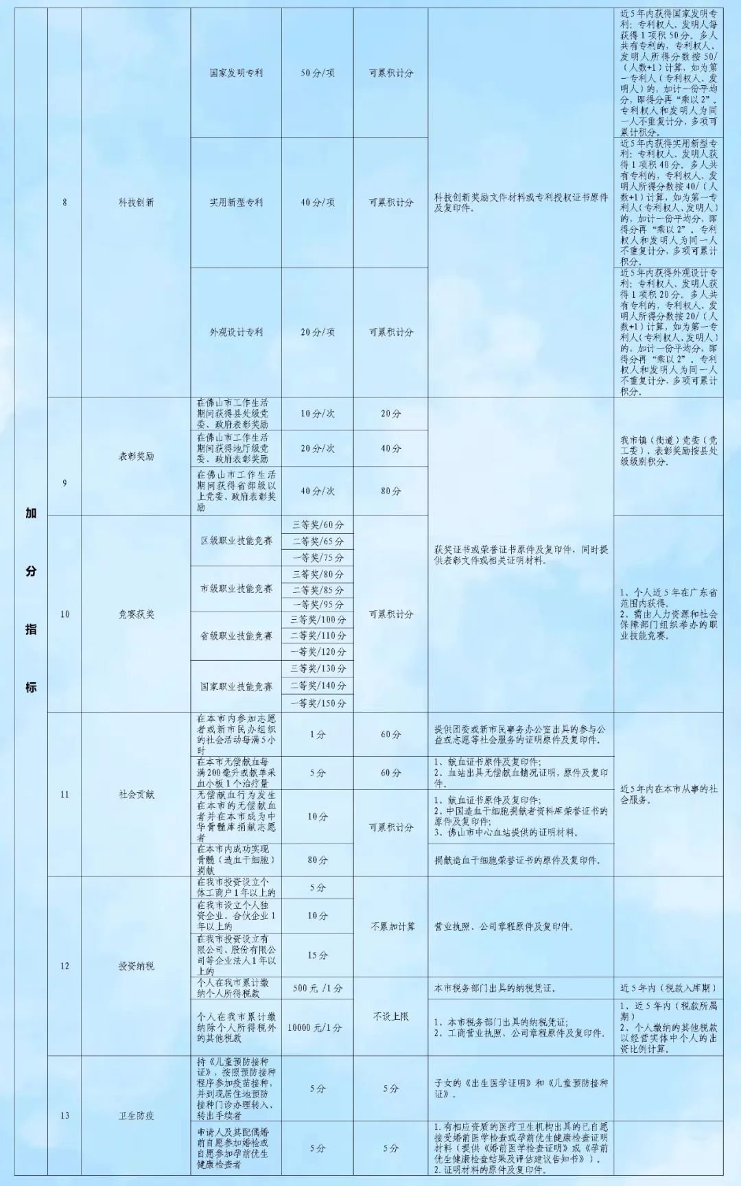 合法稳定就业:广东省内参保每险种1分/年,最高分值50分;佛山市内参保每险种额外加2分/年,最高分值100分,合计最高分值150分。