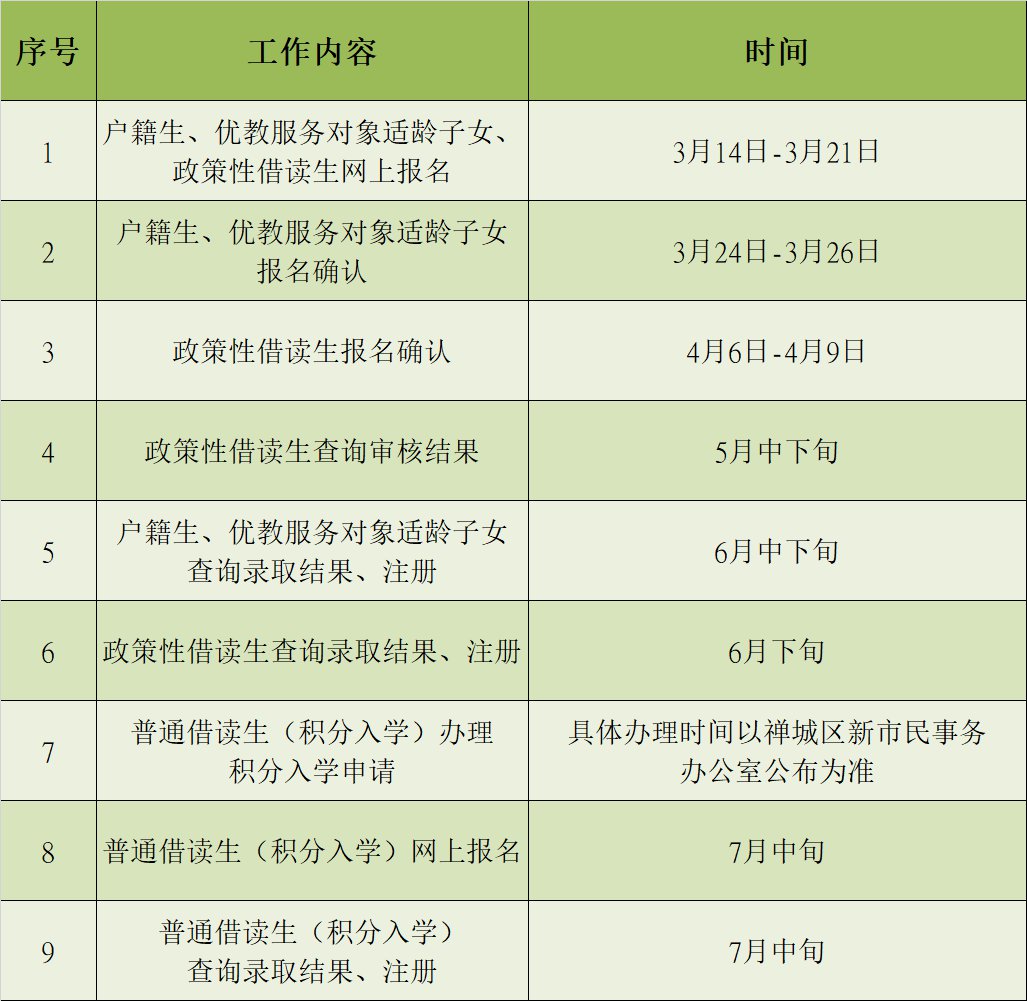 有剩余学位时,普通借读生(积分入学)于7月中旬进行网上报名(具体时间安排以“禅城教育”微信公众号公布为准)。
