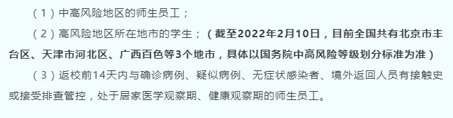 该校学生返校分批次错峰进行,其中,自2月25日起,本科生分三批返校。 有以下情况的人员暂缓返校,具体返校(报到)时间等待学校另行通知: