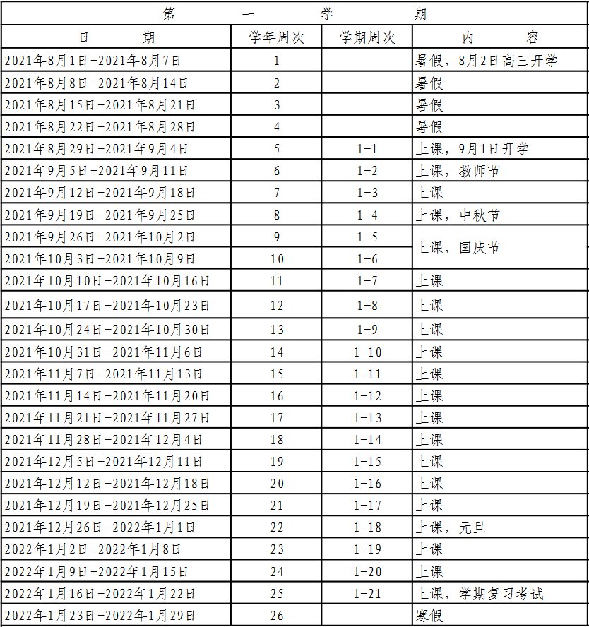 ➯珠海市2021-2022学年普通高中学校校历