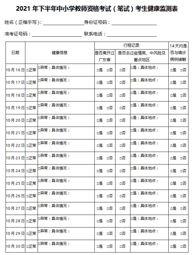 【2021年下半年中小学教师资格考试(笔试)考生健康监测表】