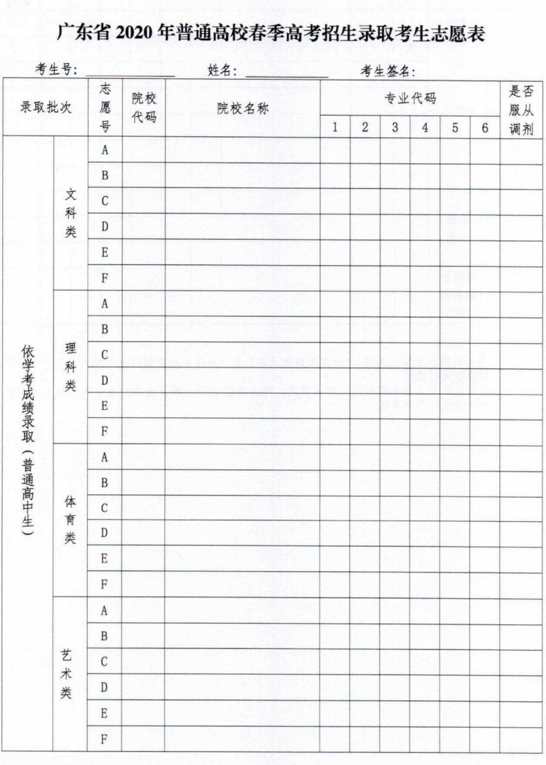 请各级教育行政部门、招生办公室迅速将此通知转发至辖区内招生办公室、普通高中学校及中等职业学校。各级招生考试机构、各中学要积极做好填报志愿的准备工作,加强春季高考招生政策的宣传和解读,让每一位考生充分知晓相关政策和要求,确保网上填报志愿安全、有序、顺利开展。 附件: 广东省2020年普通高校春季高考招生录取考生志愿表(样式)