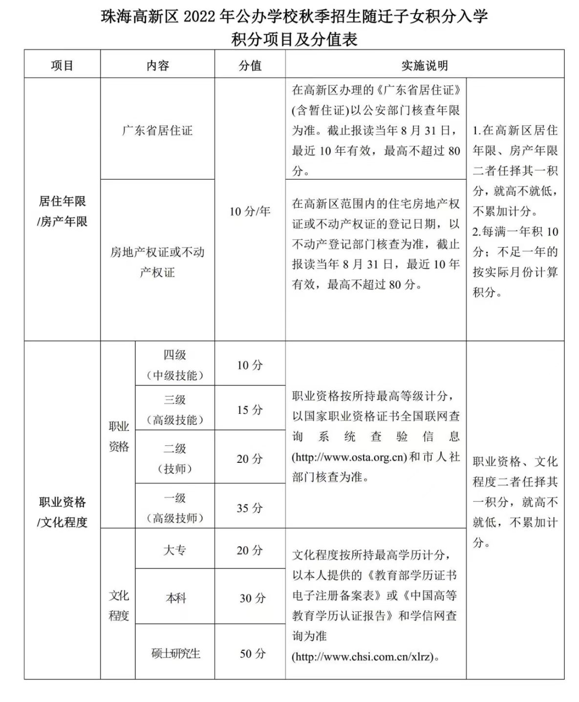 珠海高新区2022年随迁子女积分入学积分项目及分值表