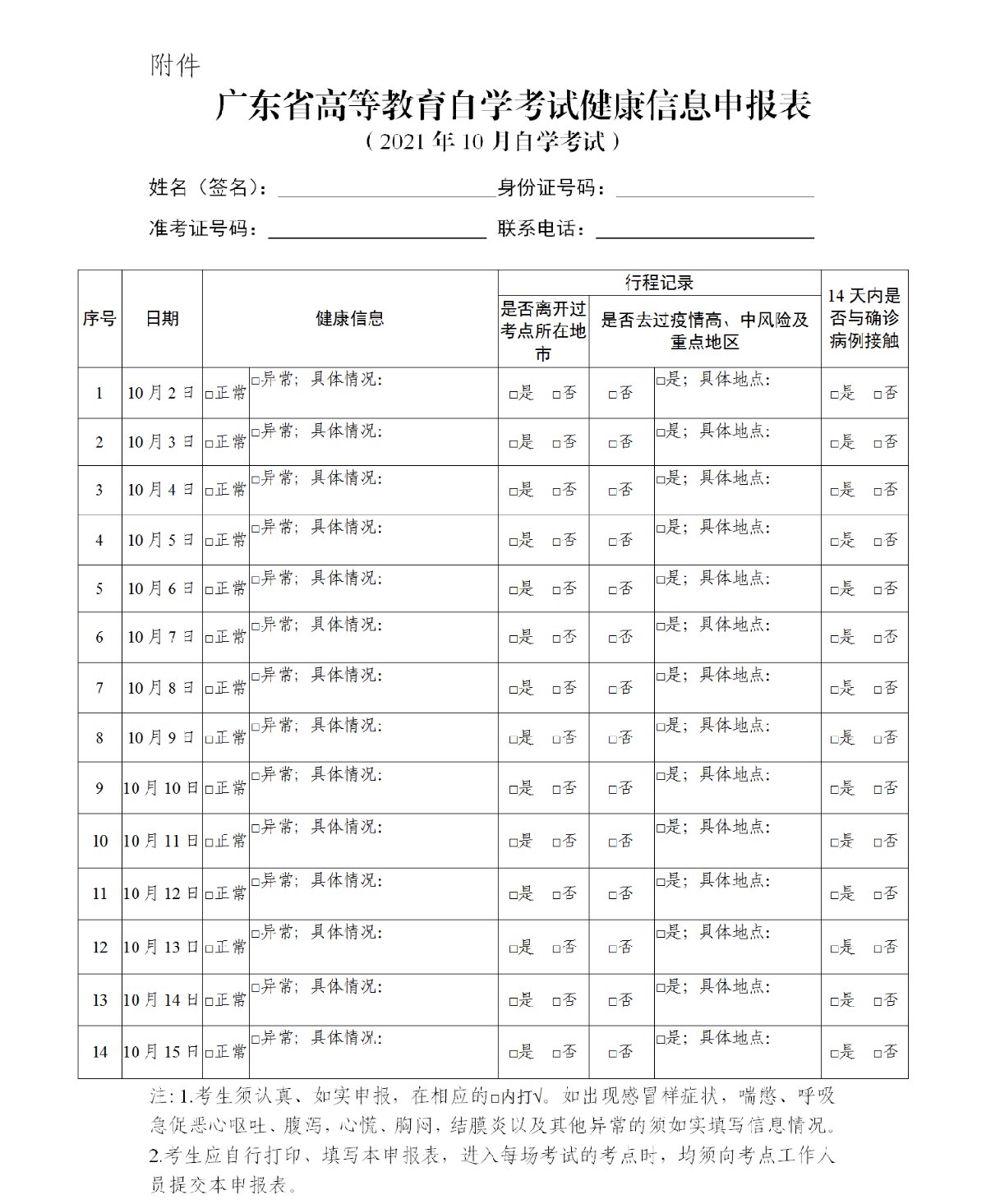 【广东省高等教育自学考试健康信息申报表(2021年10月自学考试)】