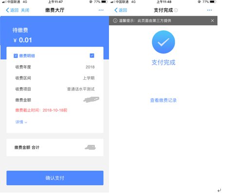 (2)打开支付宝(已领卡用户)进入卡包;选择珠海科技学院电子校园卡;进入主界面;选择“缴费系统”;选择“考试缴费”——“普通话水平测试”,点击“确认支付”至支付完成即可。
